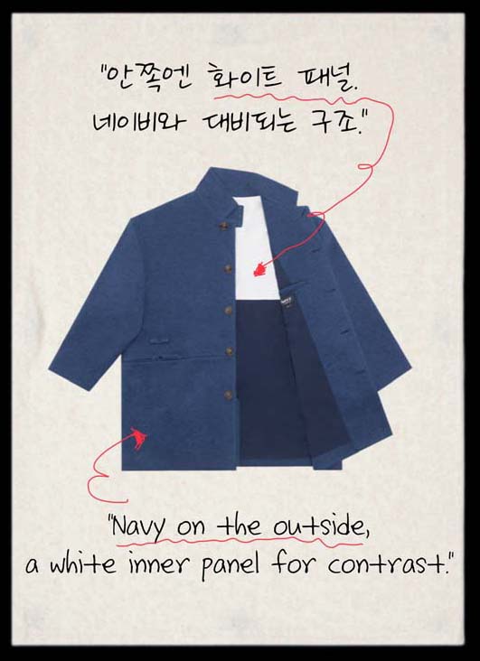 안감 하단(Lower Lining): 폴리에스터 100% (부드러운 네이비 안감 원단)