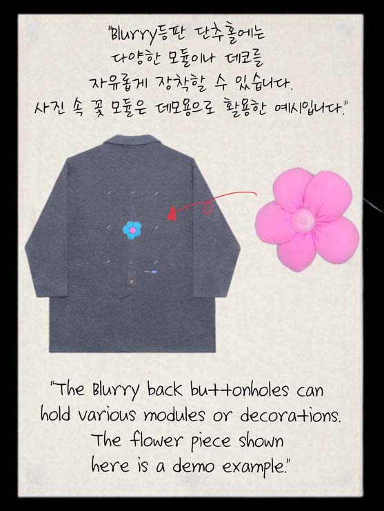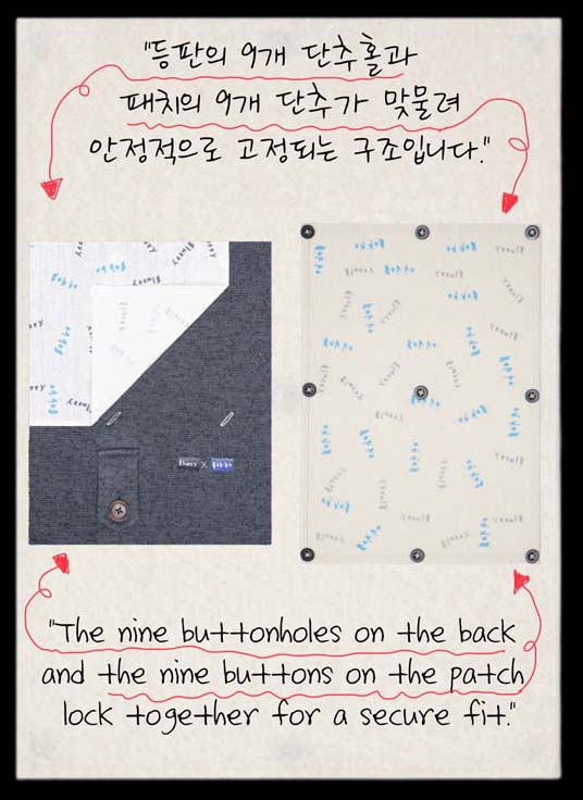 - 등판에 조각보를 달 수 있는 9개의 화이트 컬러 단추구멍