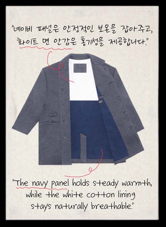 안감 하단(Lower Lining): 폴리에스터 100% (부드러운 네이비 안감 원단)