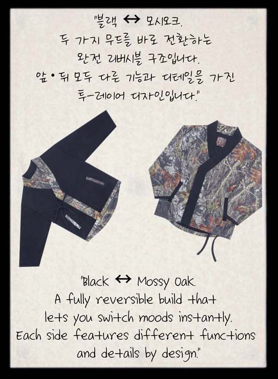 A면은 Mossy Oak 패턴 원단으로 자연의 거칠고 생명력 있는 질감을,