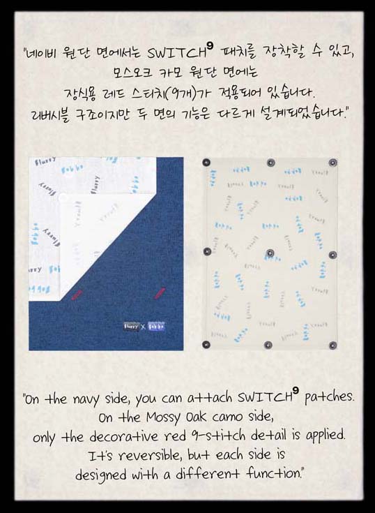 A면은 Mossy Oak 패턴 원단으로 자연의 거칠고 생명력 있는 질감을,