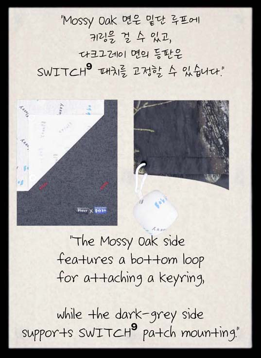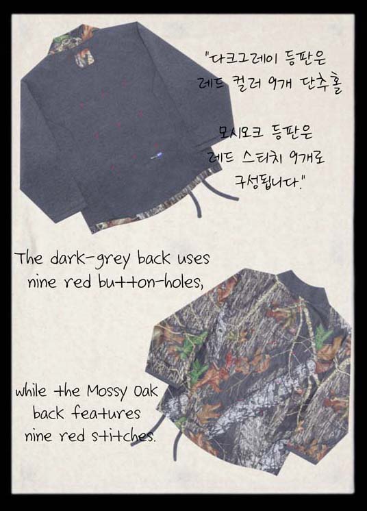 A면은 Mossy Oak 패턴 원단으로 자연의 거칠고 생명력 있는 질감을,
