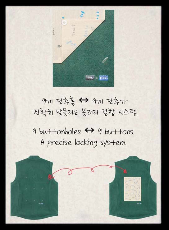 - 등판에 조각보를 달 수 있는 9개의 화이트 컬러 단추구멍