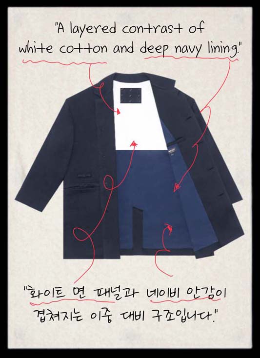 안감 하단(Lower Lining): 폴리에스터 100% (부드러운 네이비 안감 원단)